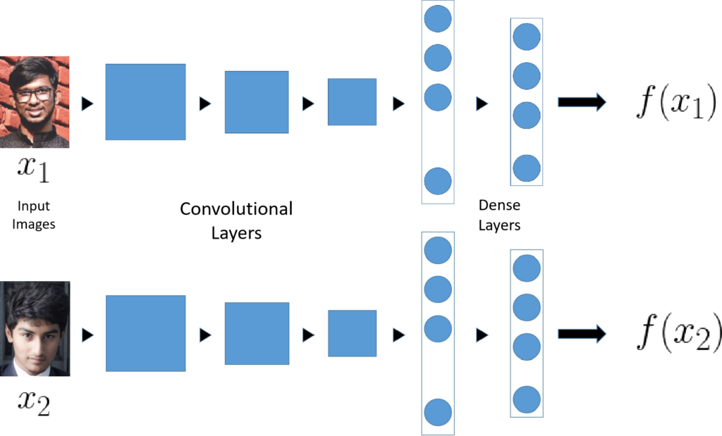 The job of the function D is to learn the level of difference between two different images of faces. A nice way to do this is by using Siamese Networks. While a traditional ConvNet consists of Convolutional layers followed by Fully Connected or Dense Layers which are then fed into a Softmax function to perform classification, in case of a Siamese Network, there is no Softmax unit, instead the last Dense layer acts as the output layers which gives a list or vector of numbers. Let us call the outputs for images x_1 and x_2, f(x_1) and f(x_2) respectively. Let’s say that the output layer has 128 fully connected units, hence, f(x_1) and f(x_2) will each be a vector of 128 numbers. f(x_1) and f(x_2) are called the Encoding of x_1 and x_2 respectively.